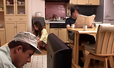 Lovely looking Japanese housewife Yuma Miyazaki sucks bone of her fortunate hubby